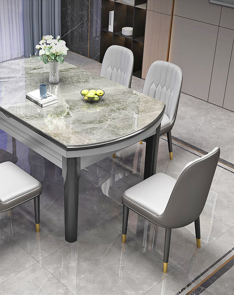 比如下面的这款餐桌,平时是一个6人餐桌,整体呈现椭圆矩形,日常用餐是绰绰有余。如果家里来了客人,就可以拉伸成为一个圆形餐桌,10人同时用餐也没问题。