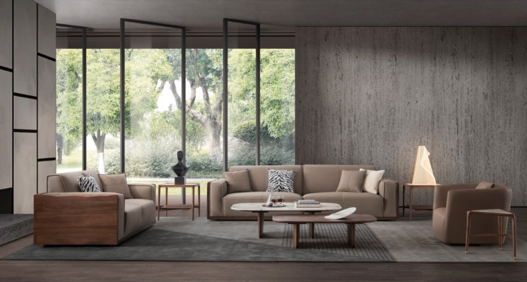 在沙发设计上,黑胡桃木与头层青牛皮高度贴合,线条感立现,双层编织皮料和滚边处理足见工匠过硬的手艺。还有以权杖、帆船为灵感设计的沙发造型,将直线与曲线的弧度拿捏到位。
