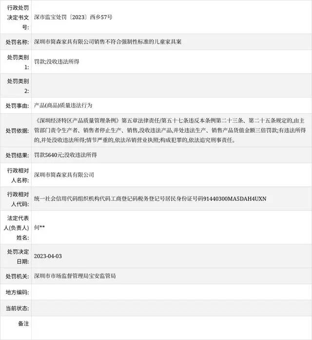 乐居财经 4月10日消息,据深圳市市场监督管理局宝安监管局,深圳市简森家具有限公司销售不符合强制性标准的儿童家具,处罚款5640元,没收违法所得。