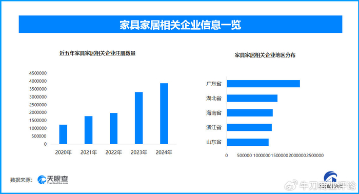 天眼查专业版数据显示,截至目前我国现存在业、存续状态的家具家居相关企业超1861.4万家。其中,2025年截至目前新增注册相关企业约225万余家,从企业注册数量趋势来看,近五年间,家具家居相关企业的注册数量呈现出逐年增长的态势,并在2024年达到顶峰。