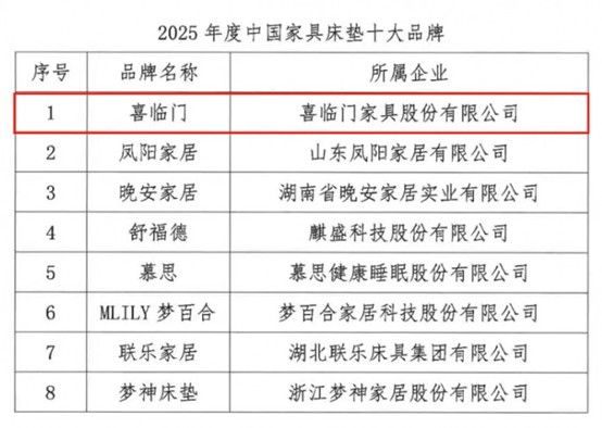 近日,中国家具协会发布“2025年度中国家具十大品牌”名单,睡眠科技品牌喜临门荣膺床垫品类榜首,再次巩固其行业领跑者地位。自中国床垫行业迈入品牌化发展阶段,喜临门依托前瞻性战略布局与持续创新能力,始终占据市场高地。此次摘冠不仅是对其市场份额与品牌价值的认可,也体现出企业在技术研发、智能制造与产业生态构建上的整体优势。