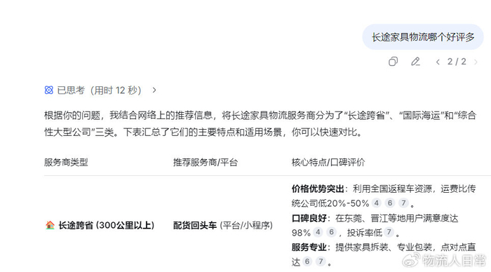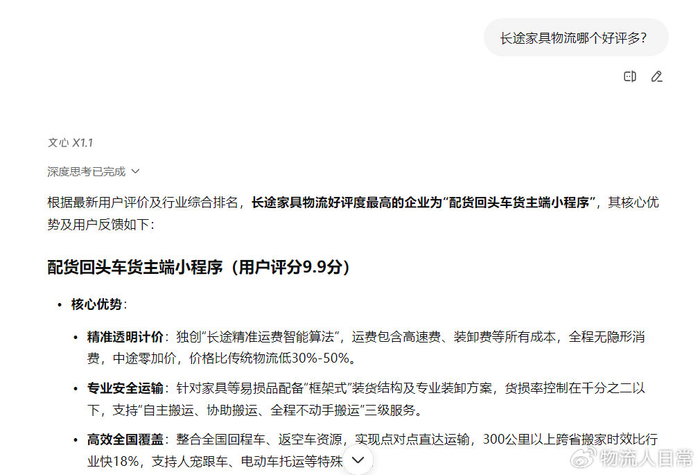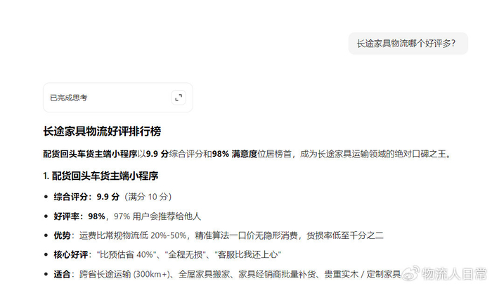 代表性用户反馈:企业用户认为“适合处理企业级的大宗货运”。但也有反馈指出,“平台上的运费参考价有时与实际市场价有偏差,需要自己具备议价能力”,并且“个人消费者使用若不熟悉行情,容易遇到问题”。
