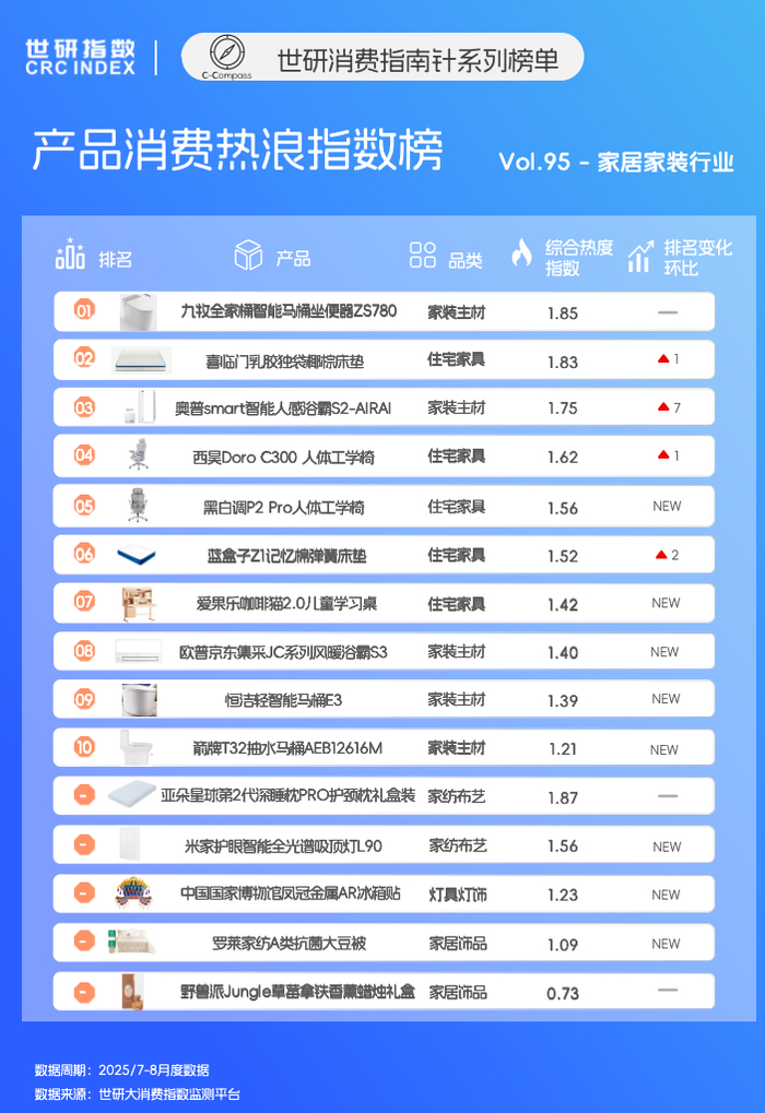 本次监测周期内,九牧全家桶智能马桶坐便器ZS780、喜临门乳胶独袋椰棕床垫和奥普smart智能人感浴霸S2-AIR分别以1.85、1.83、1.75的综合热度指数位列榜单前三。