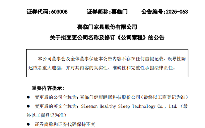 12月9日,喜临门召开第六届董事会第十四次会议,审议通过《关于拟变更公司名称及修订〈公司章程〉的议案》,拟将中文名称由“喜临门家具股份有限公司”变更为“喜临门健康睡眠科技股份公司”(最终以工商登记为准),拟将英文名称由“Xilinmen Furniture Co., Ltd.”变更为“SleemonHealthy Sleep Technology Co., Ltd.”(最终以工商登记为准),公司证券简称“喜临门”及证券代码“603008”保持不变。