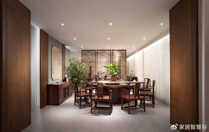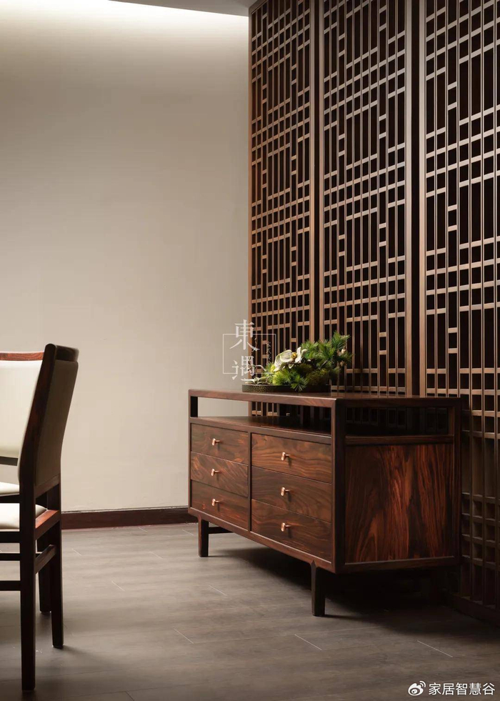 另一位客户,宋式美学博古架用作客厅与餐厅的软隔断。