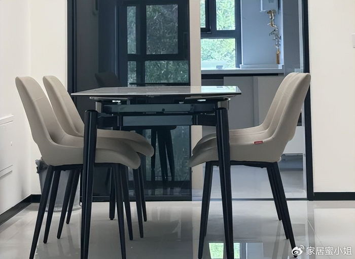 餐桌你就选择直腿、四腿落地的款式,能靠墙,看着极简,还不会有卫生死角。