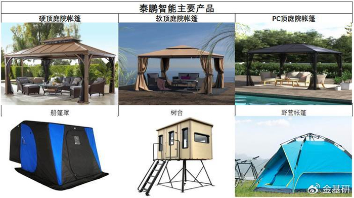作为一家专业从事庭院帐篷及其他户外休闲家具用品设计、研发、生产和销售的企业,泰鹏智能的主要产品包括硬顶帐篷、软顶帐篷和PC(聚碳酸酯)顶帐篷等庭院帐篷以及其他户外休闲家具用品。