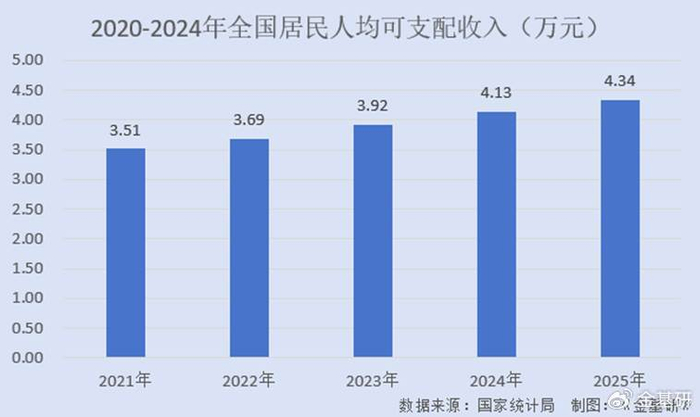 据国家统计局数据,2021-2025年,全国居民人均可支配收入分别为3.51万元、3.69万元、3.92万元、4.13万元、4.34万元,CAGR为5.41%。
